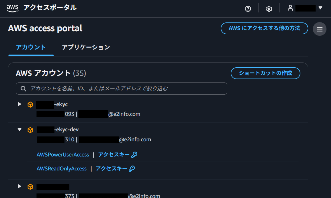 AWS アクセスポータルの画面で「アカウント」タブにあるAWSアカウント、つまり自分の所属しているAWS Organizationが管理しているAWS アカウントであればログインが簡単です。
