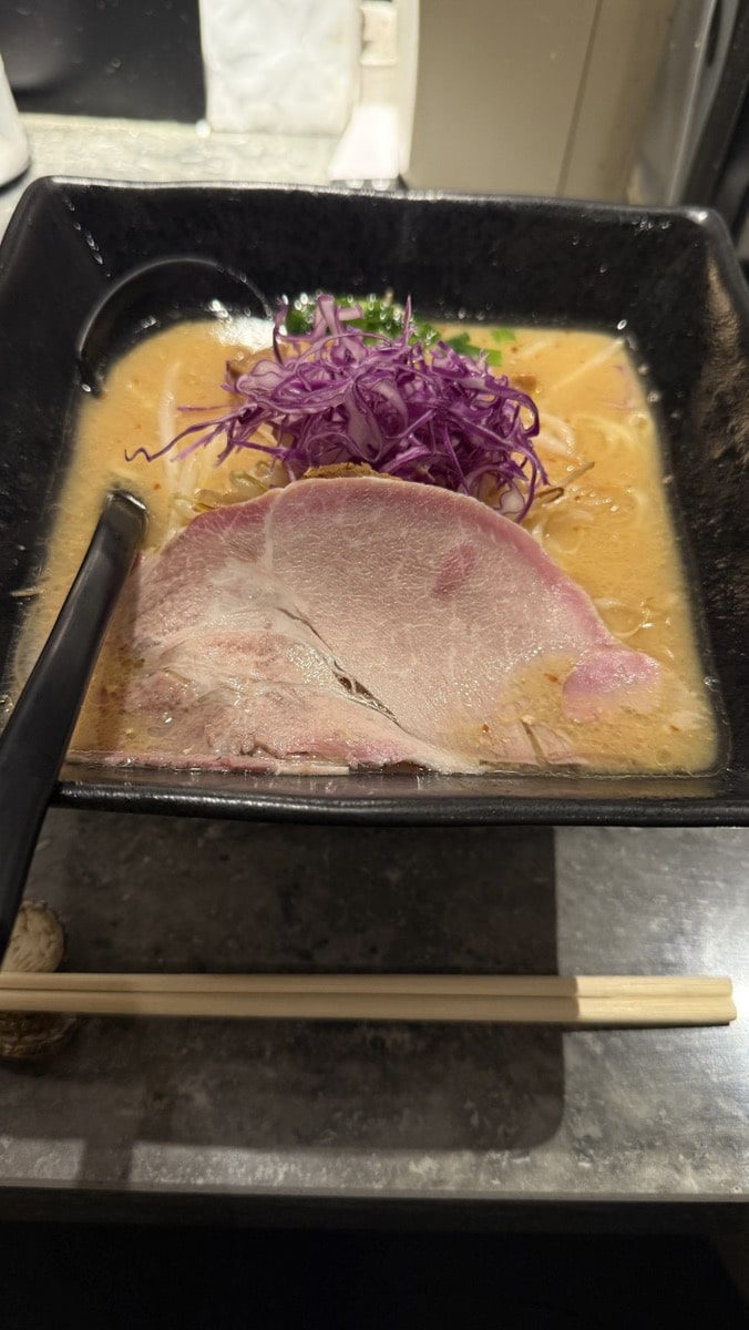 四角い器が特徴的な味噌ラーメン、螺旋階段を上った2階にある隠れ家的ラーメン店。弊社から5~10分程度歩いたところにある。