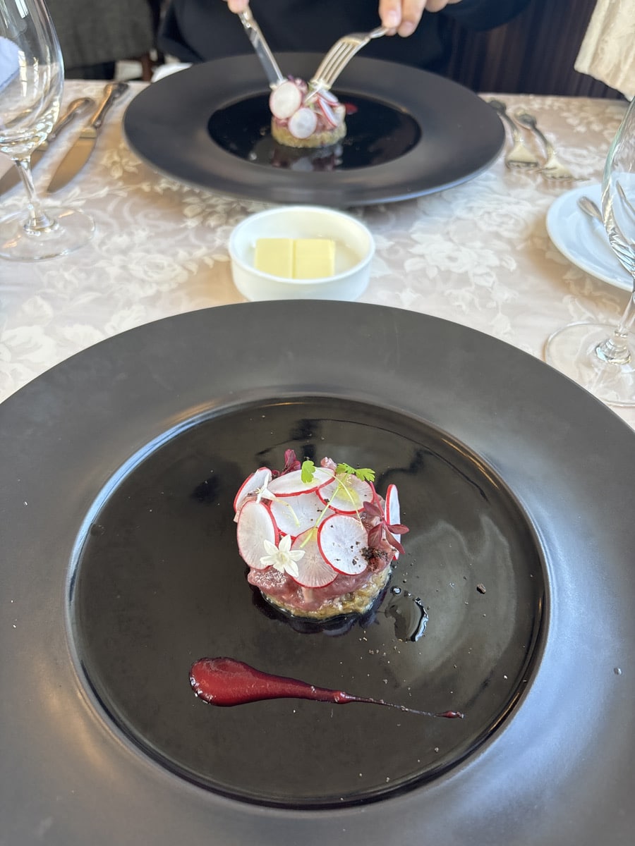 前菜:鰹のマリネ キャビアドオーベルジーヌとフランボワーズ
