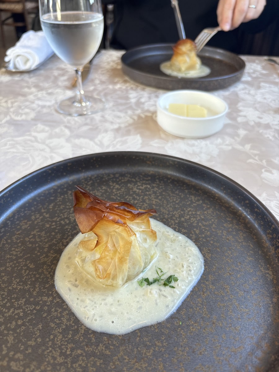 パイに包まれた海老の風味がクリーミーなソースに絡む一品。
