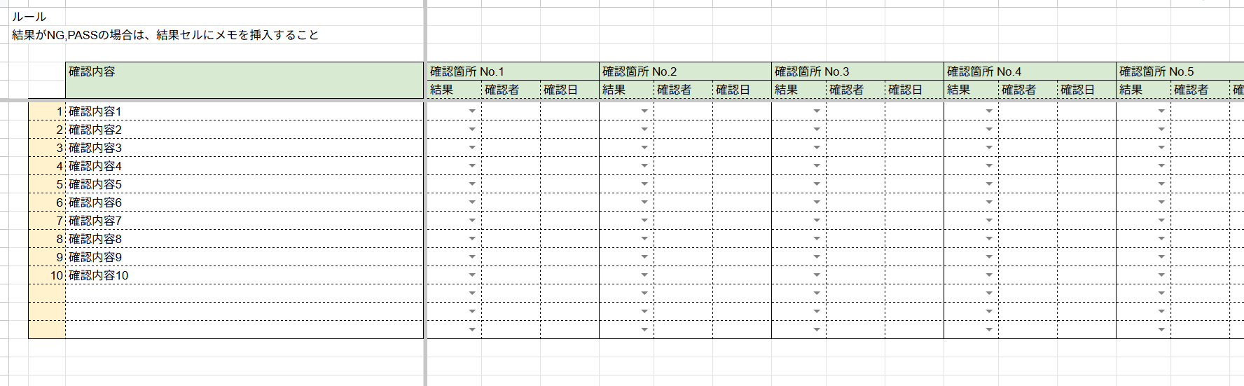 - 横に確認箇所の列が続いている(テンプレートでは10セット用意している)