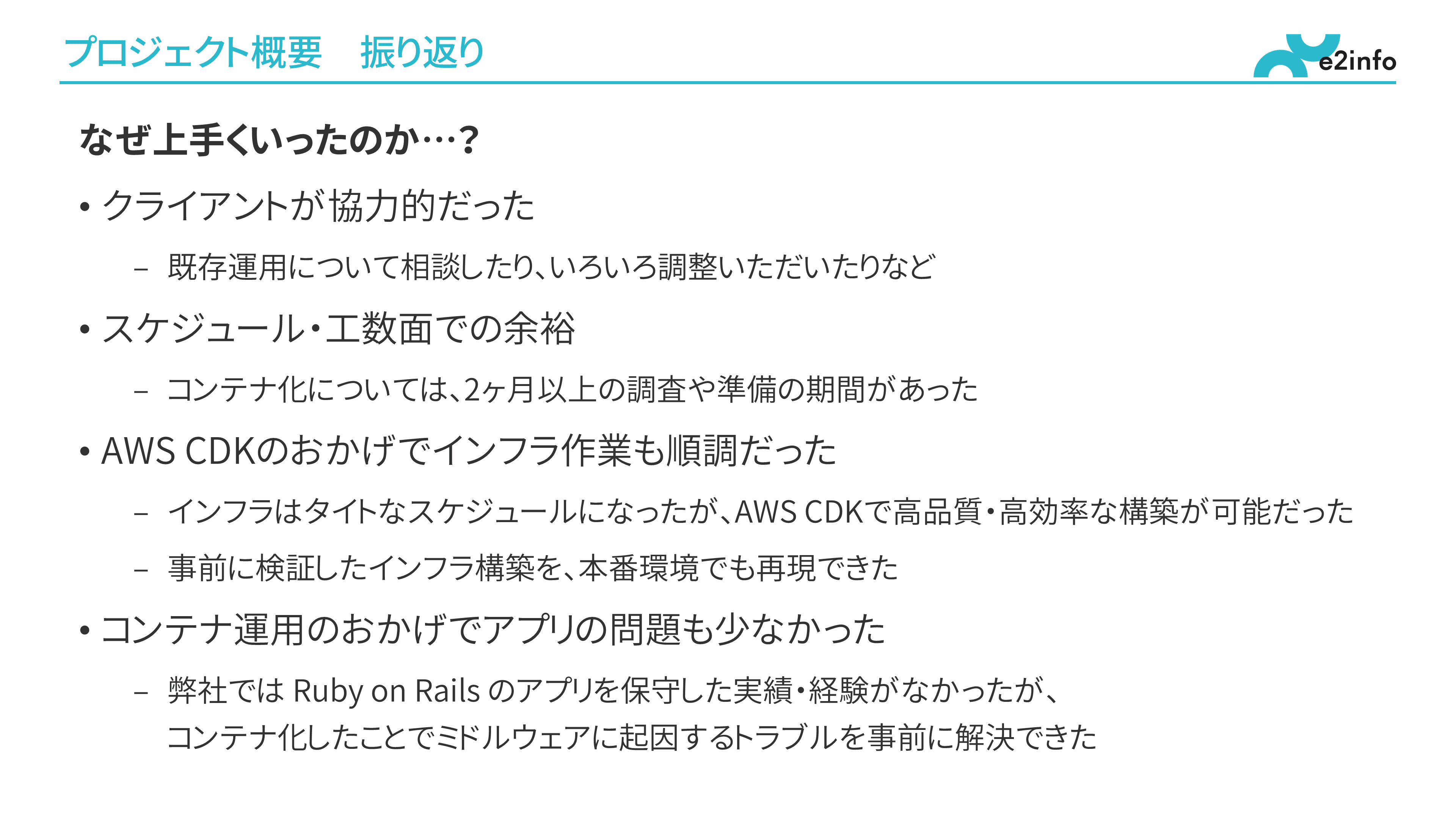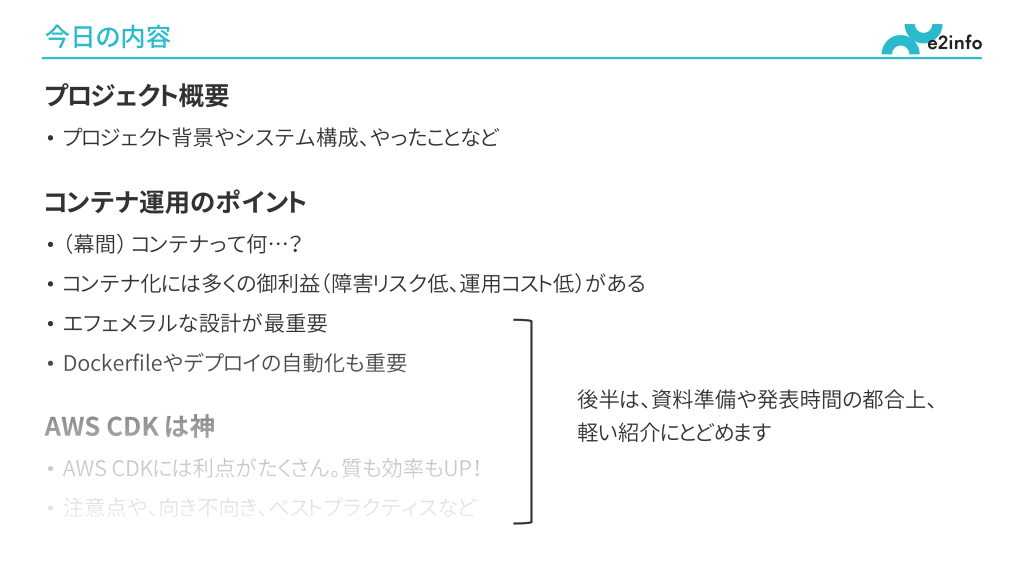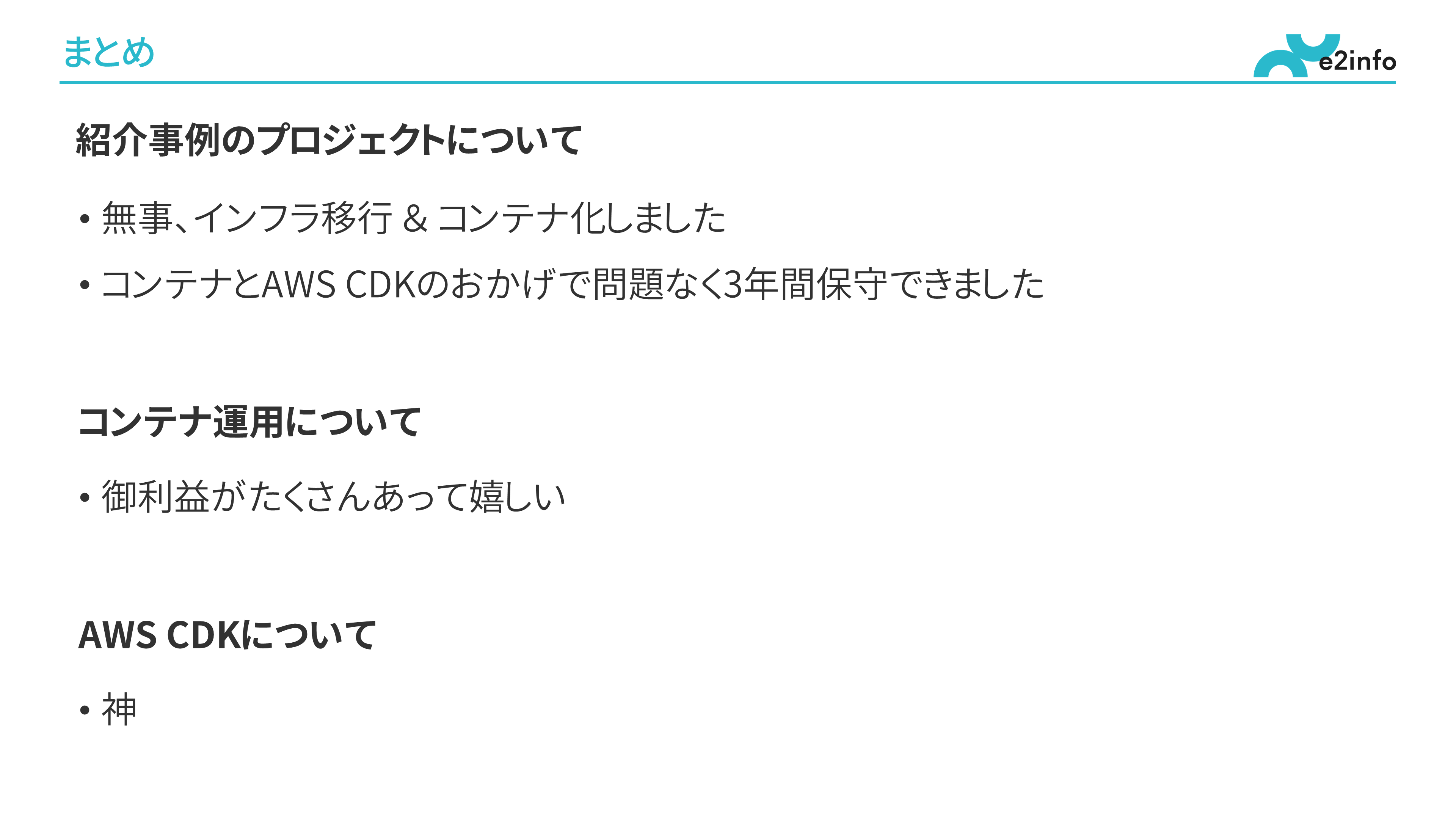 「プロジェクトの概要説明」「そもそもコンテナとは何か」「コンテナ運用の利点」の3つについてお話させていただきました。本当はAWS CDKの話もしたかったのですが、時間の都合で割愛しました。