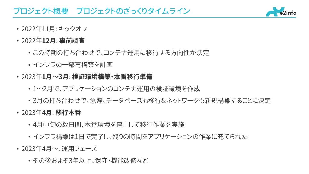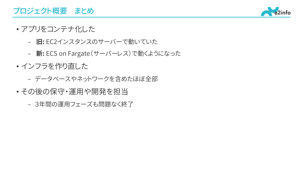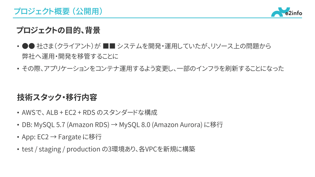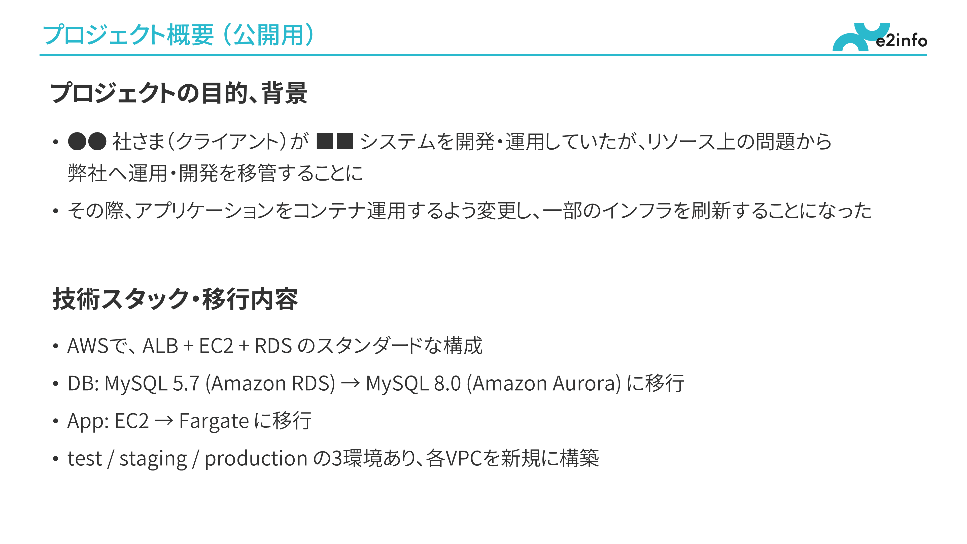 詳しいプロジェクトの話は省略しますが、一言で言うと「EC2で運用されていたRailsアプリケーションを、コンテナ化&インフラ刷新する」というプロジェクトでした。