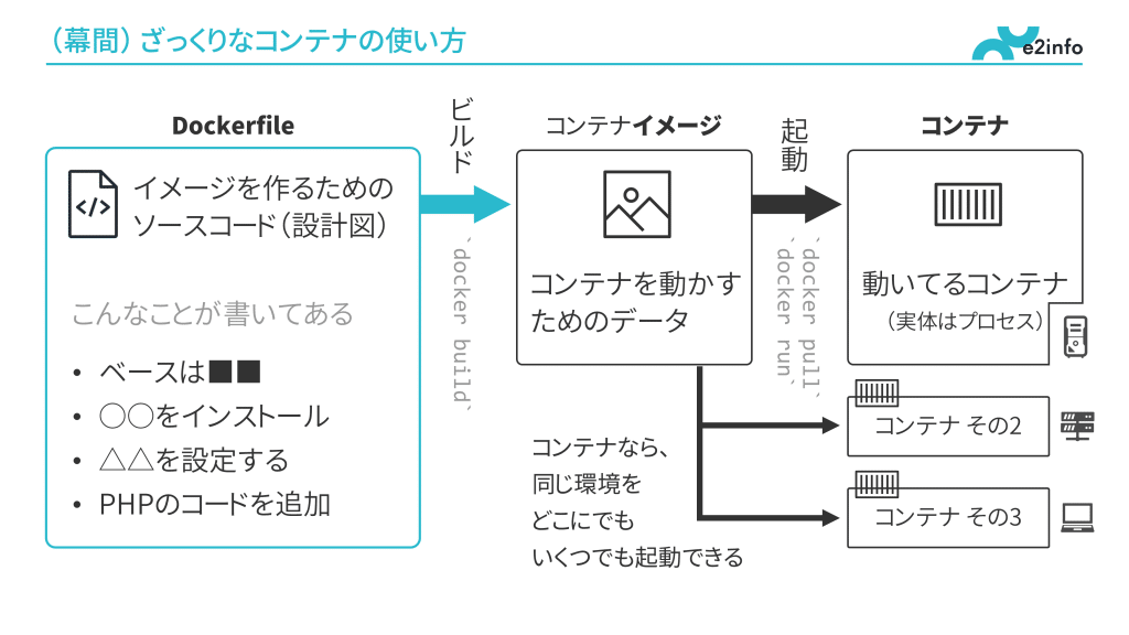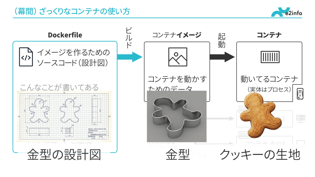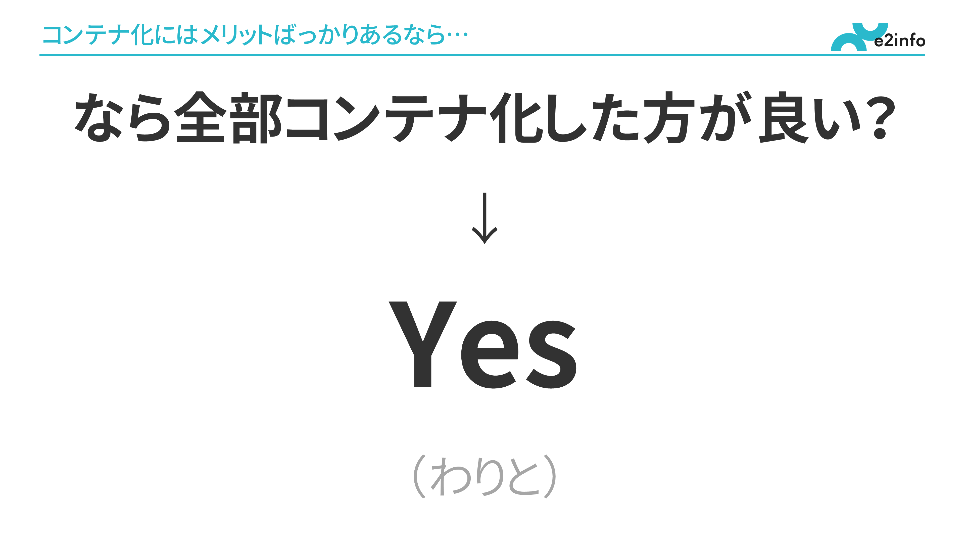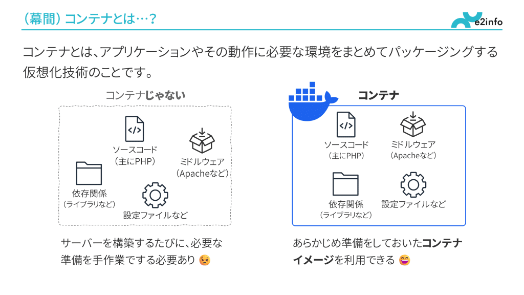 本発表のメインテーマ「コンテナ運用は利点がいっぱい!」という話をするにあたって、エンジニアでないメンバー向けに「コンテナとは何か」という話を挟みました。当初は「幕間」としておまけのつもりでしたが、発表時間の都合もあり今回のテーマの1つになりました。釈迦に説法かと思いますので、この記事ではスライドの紹介のみにとどめます。