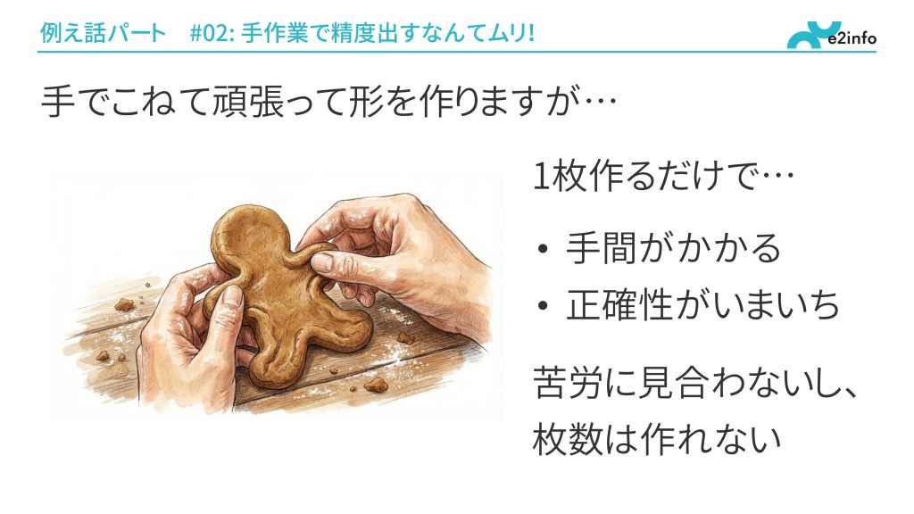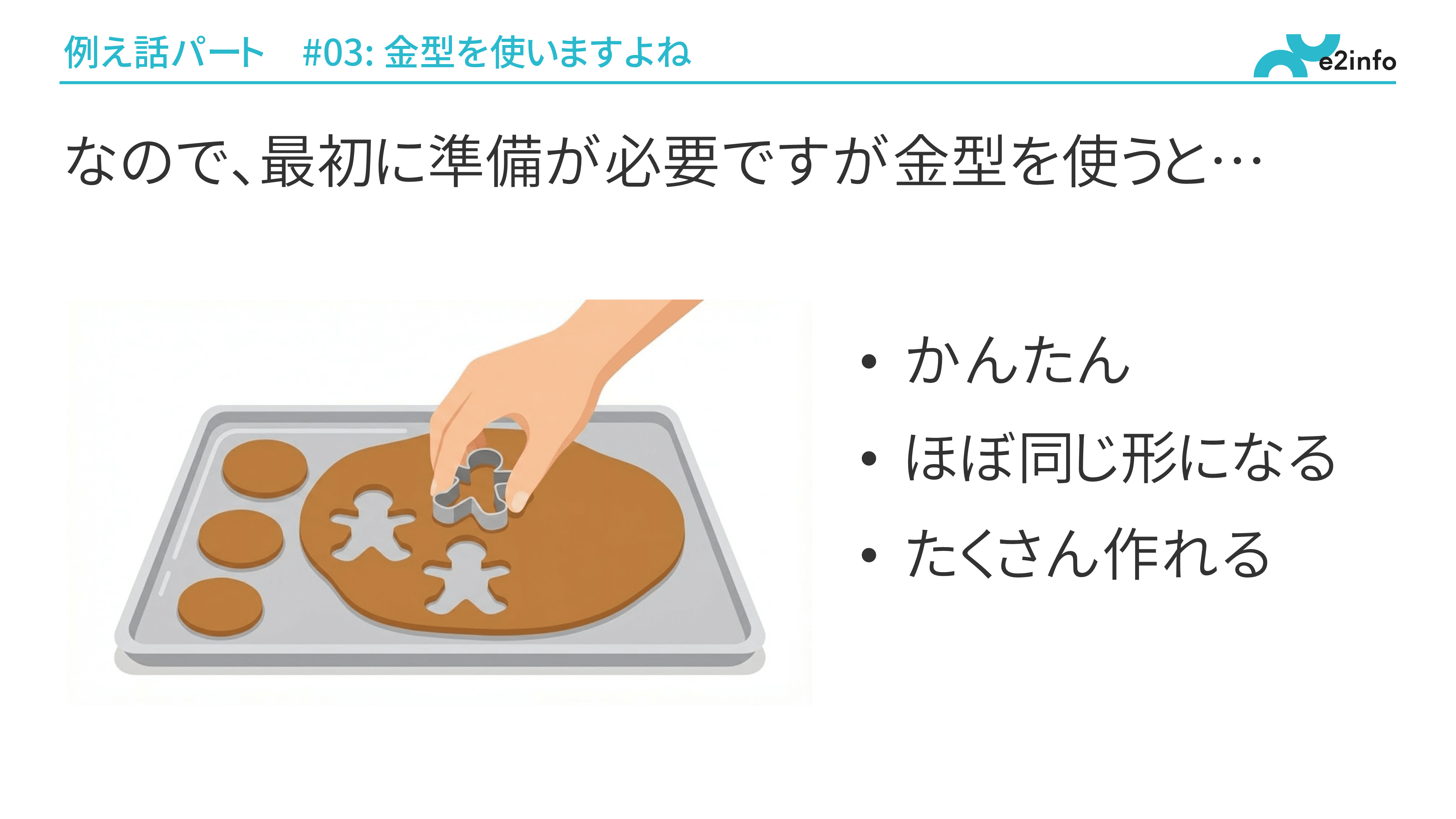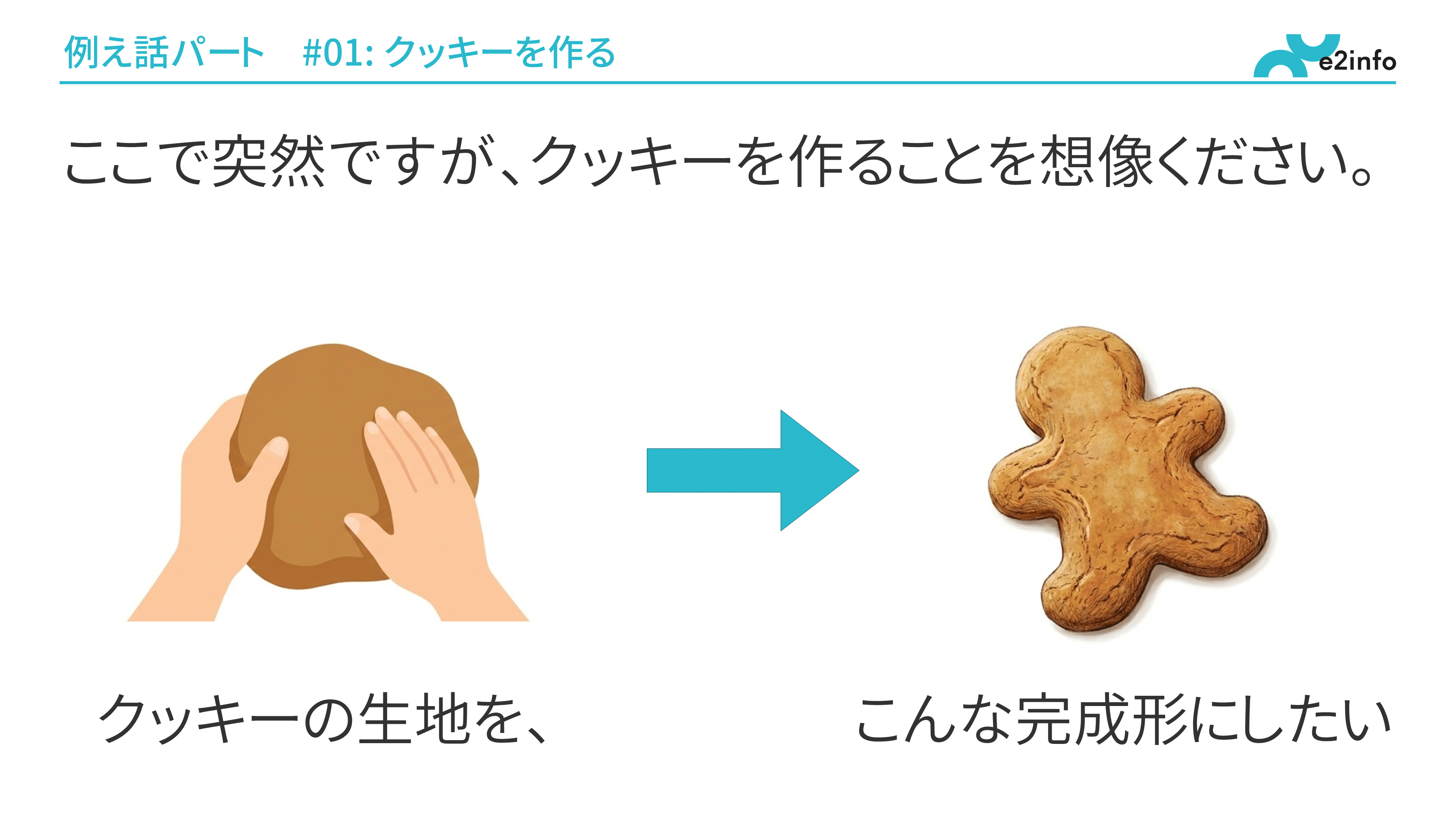 この図だけでは直感的でなかったので、Geminiに「クッキー作り」の例えのための図を描いてもらいました。