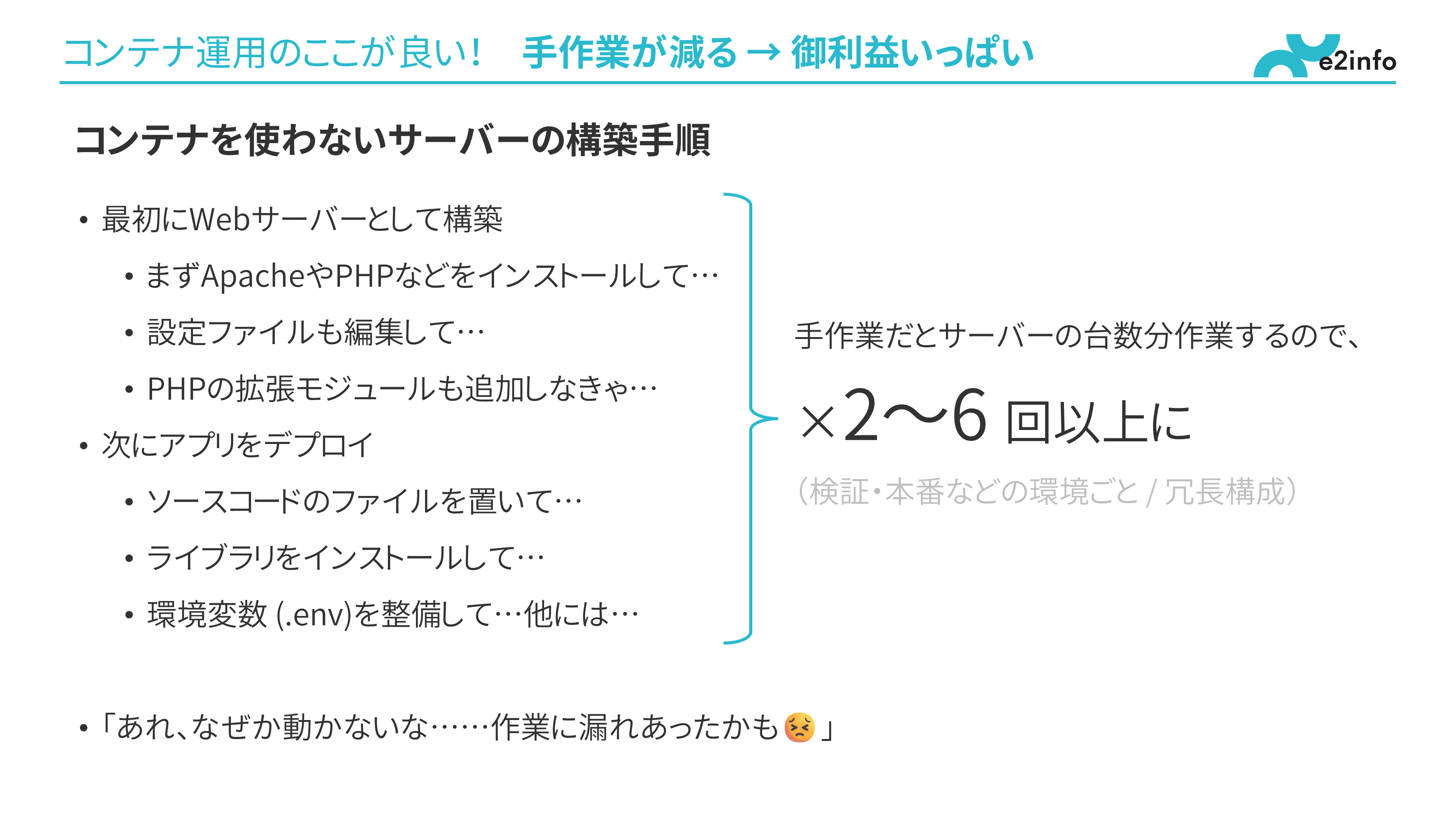 コンテナ運用で得られるメリットは、やはり手作業が減る利点が大きいです。少々恣意的ですが、コンテナを使わない場合の手順と、コンテナを使った場合の手順で比較するとこうなります