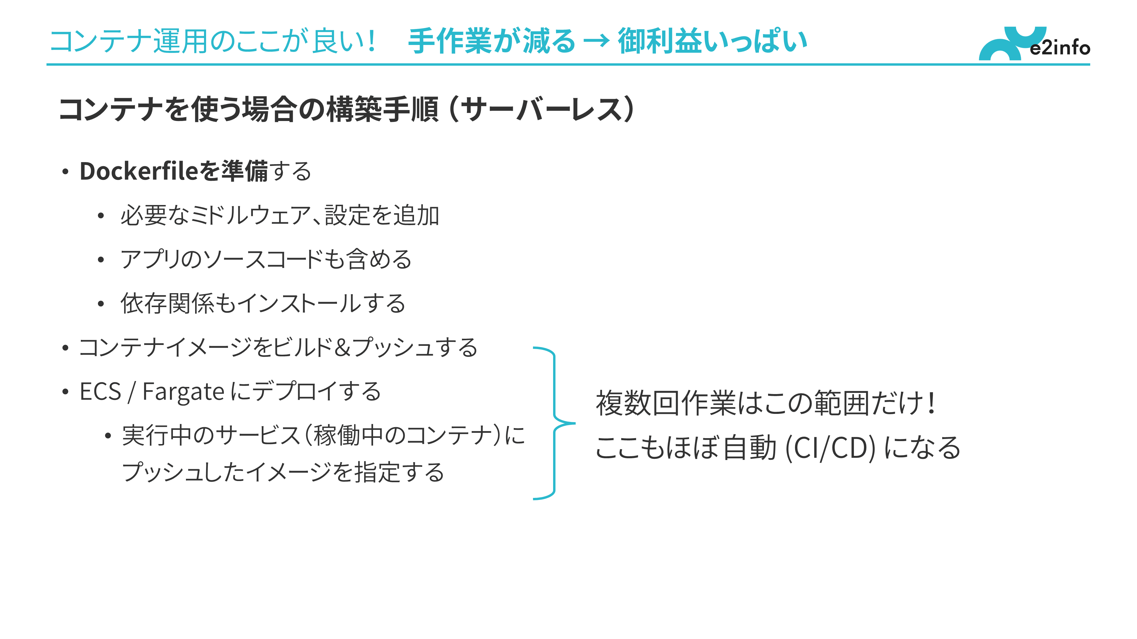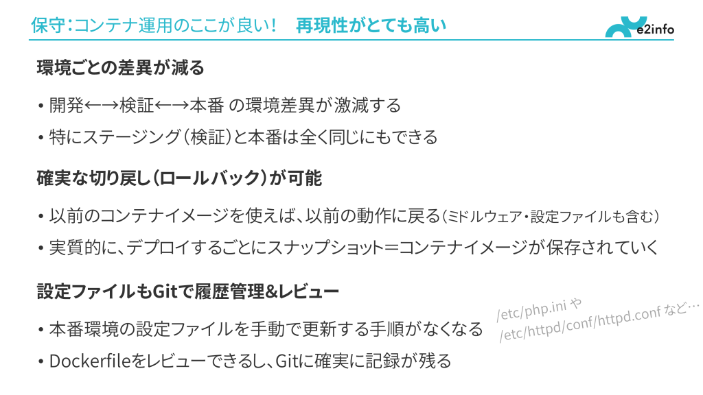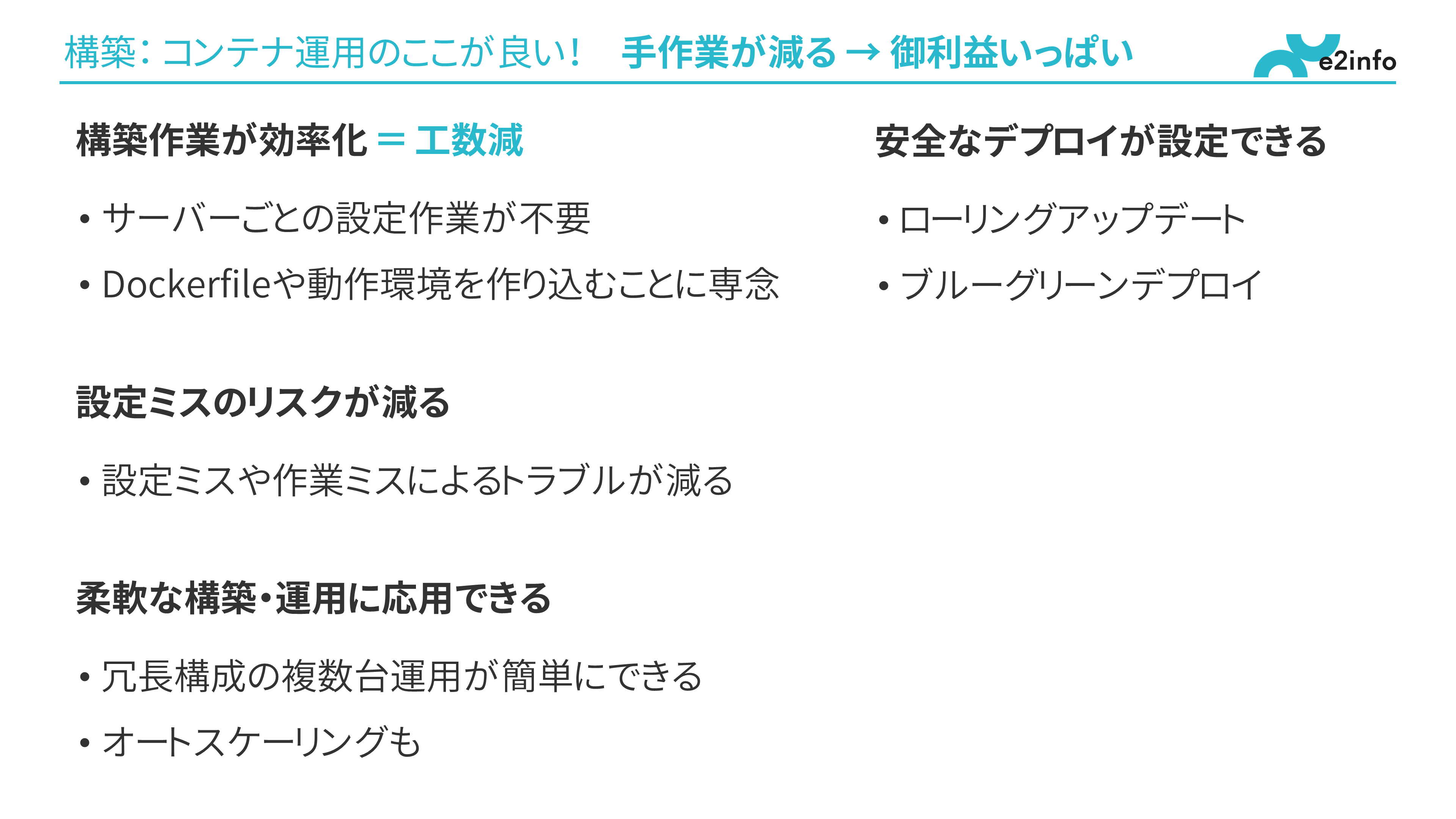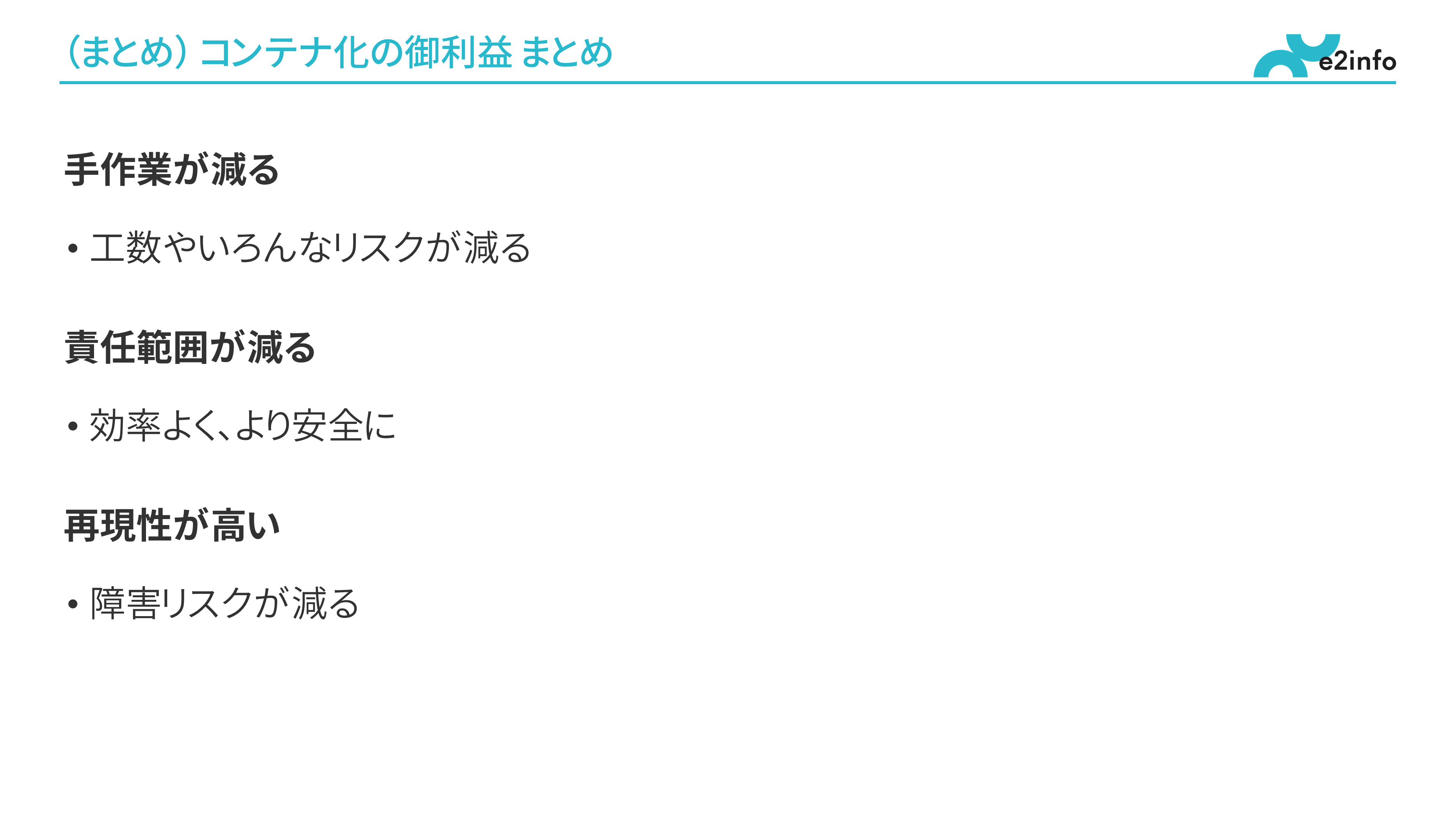 少し強引ですが、コンテナの概要を理解してもらったということでさっそくコンテナ運用の良かったところの紹介に入ります。