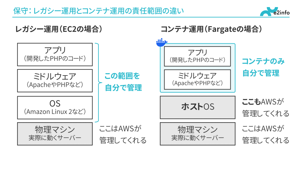 AWSを使っていれば、データベースには Amazon EC2 ではなく Amazon Aurora (Amazon RDS) を利用すると思います。ロードバランサも、EC2ではなくALBを使います。それと同様に、Webアプリケーションも汎用サーバーのEC2ではなく、AWS Fargate で運用するべきです。
