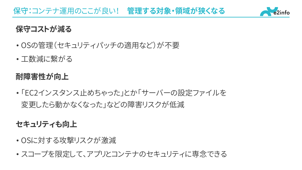 OSを管理しなくてもよく、アプリケーションに集中できるようになることで運用の負担が減ります。セキュリティや安定性も向上します。