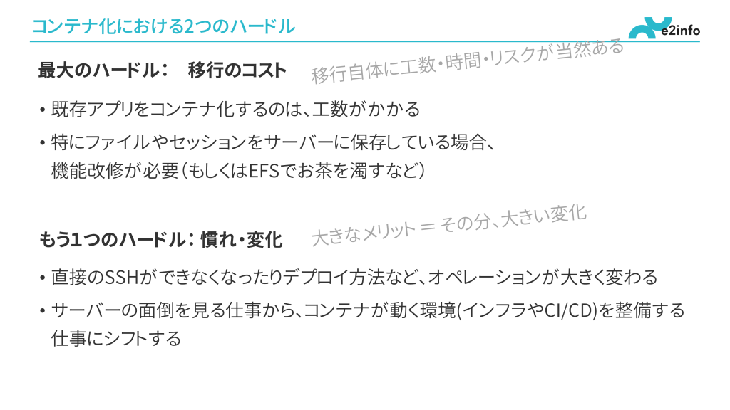 しかし、もちろんそうはならない理由があって、移行作業自体のコストと、オペレーションが変わることによるリスクの2つが主なハードルとなります。