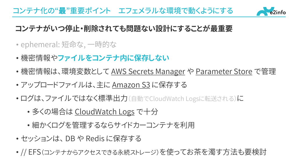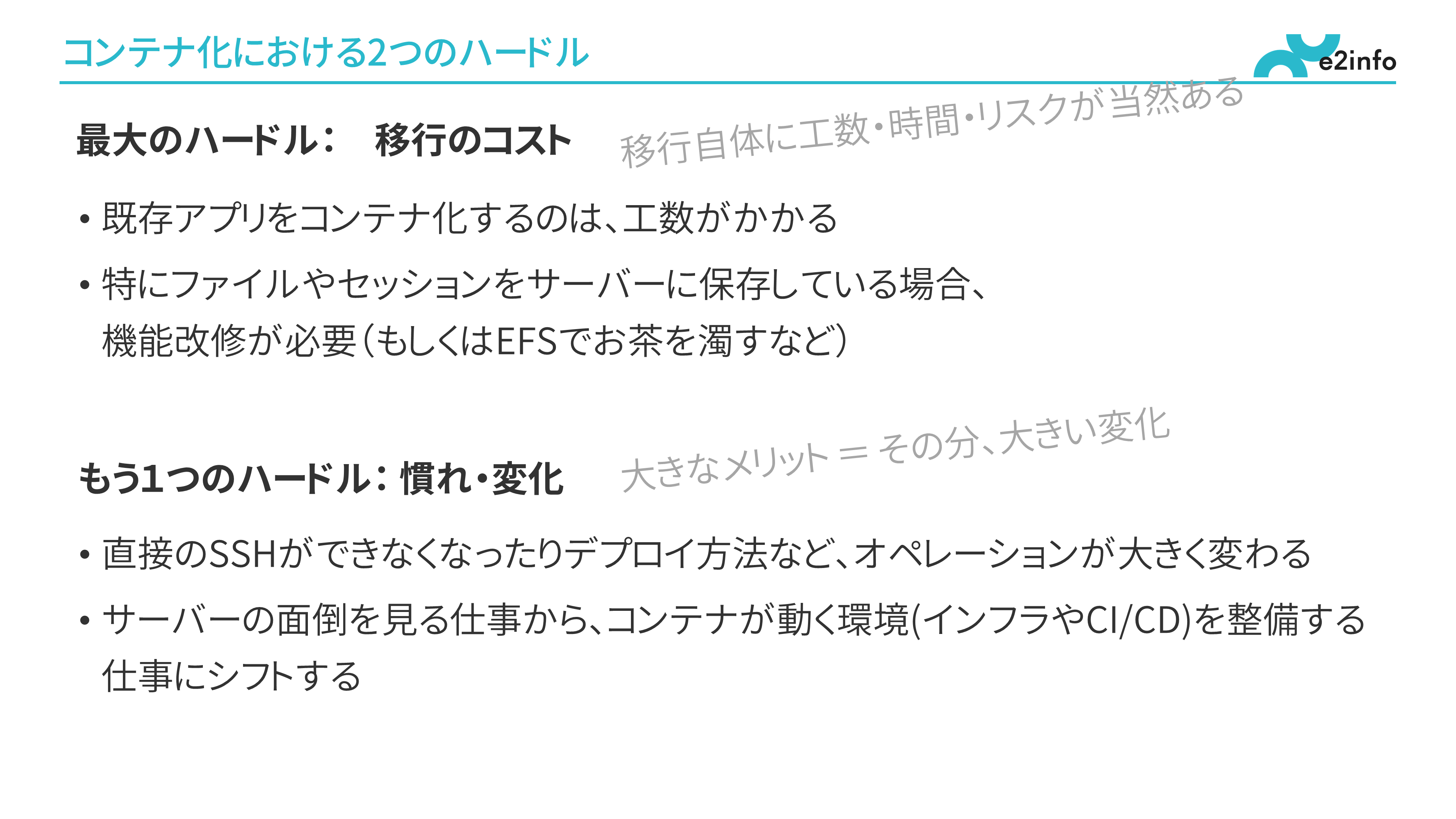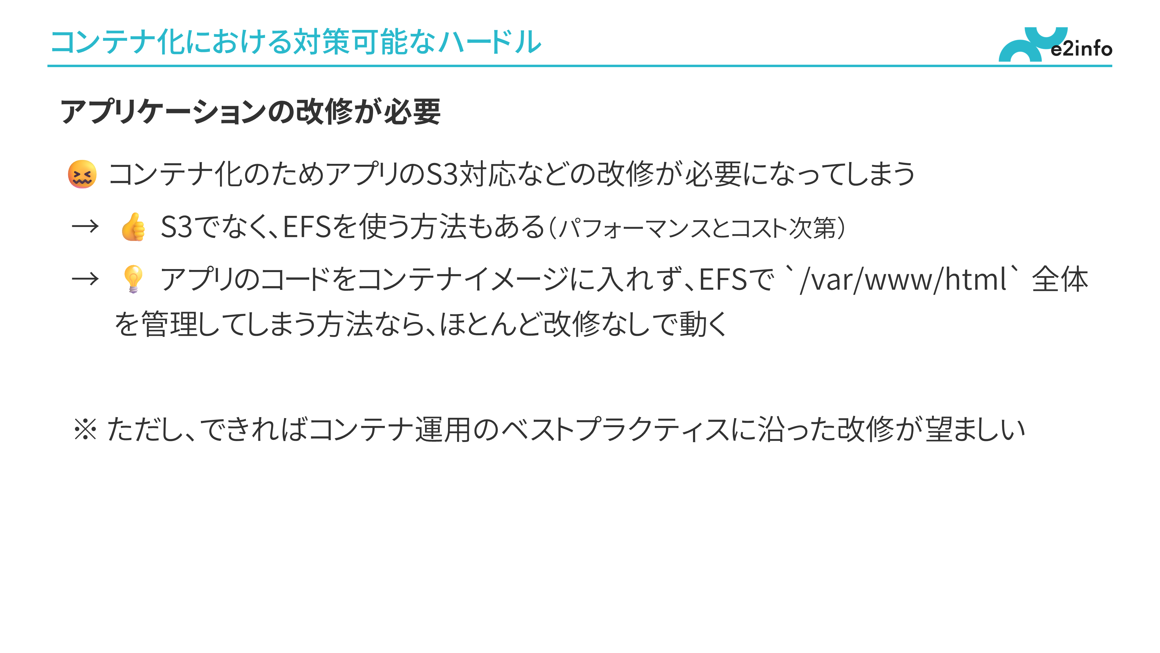 もう1つの問題として、コンテナ化にあたってはアプリケーションの対応も必要になります。