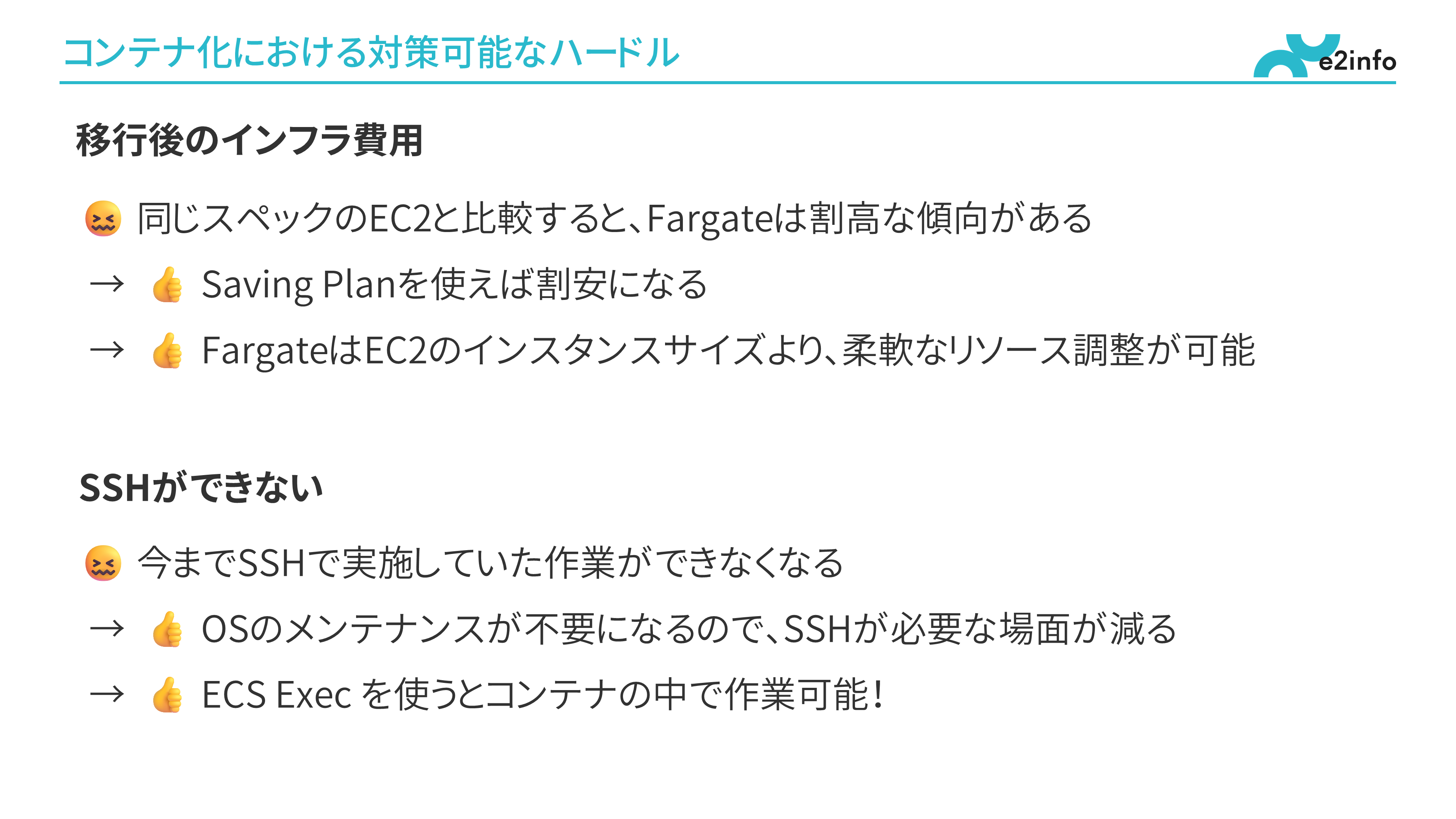 他にもコンテナ運用でのハードルはありますが、移行コストと慣れの問題以外は対策は可能な範囲かと思います。例えば、FargateのインフラコストがEC2よりも割高という欠点はあるのですが、Saving Planを使うとEC2のReserved Instanceと同等のコストで運用できるようになります。また、FargateではSSHできないですが、代わりとなるECS Execがあります。もっといえば、SSHを使わなくても調査できるようトレーサビリティ・オブザーバビリティを改善するのが望ましいです。