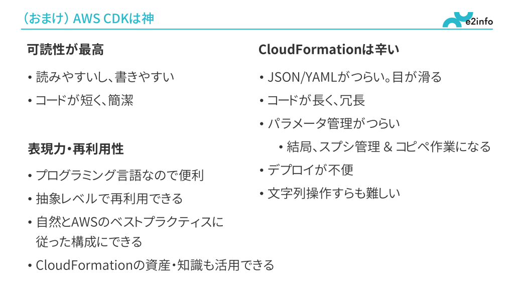 今回の発表では「コンテナ運用ではこんなに良いことがあった!」という話を紹介しまして、もう1つの重要な技術スタックであるAWS CDKの話ができませんでした。AWS CDKを使うと、CloudFormationよりも柔軟にAWSのリソースをコード管理することができます。インフラ移行がスムーズに実施できたのは、このAWS CDKのおかげなので、次回はAWS CDKの話もできればと思います。